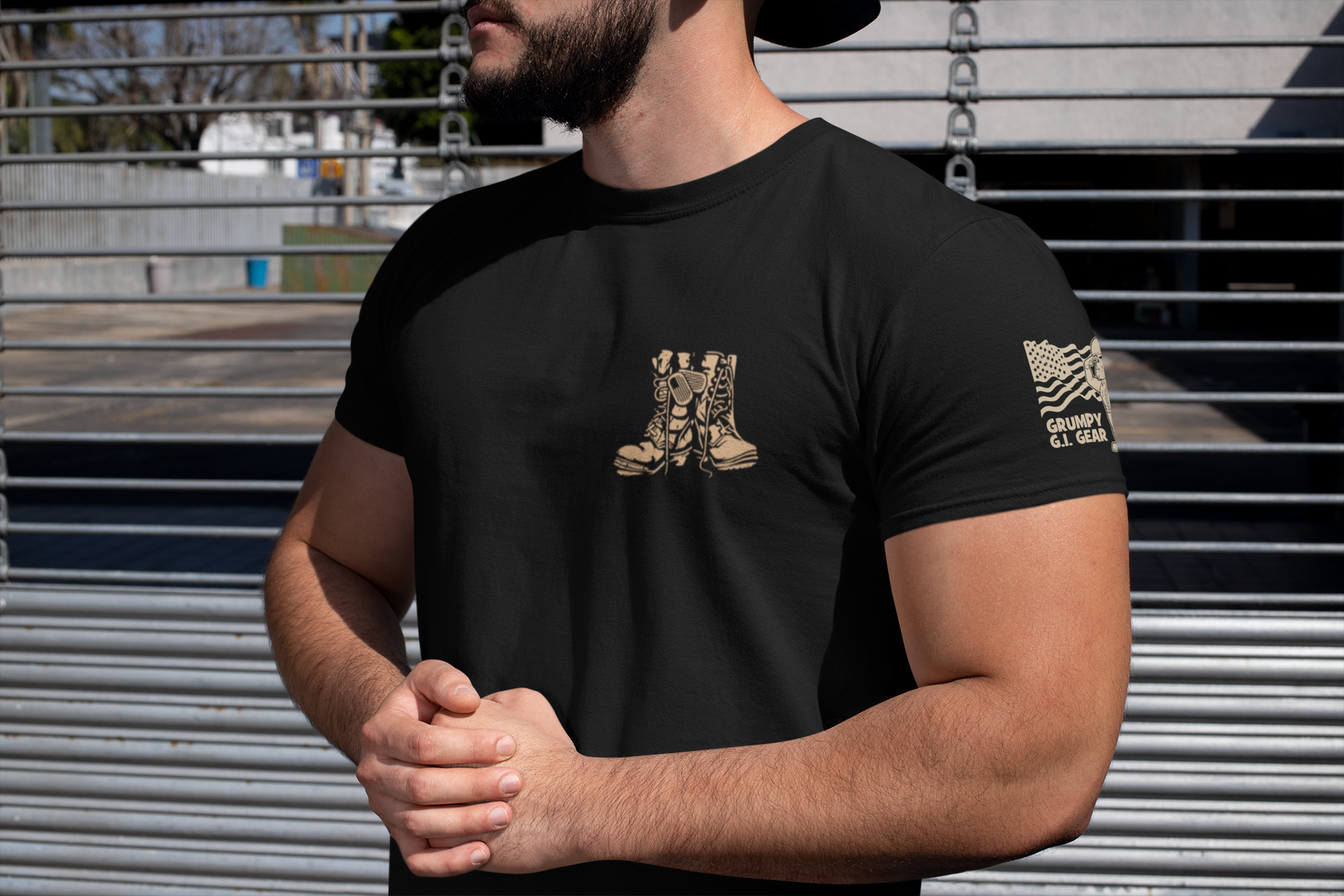 The “Veterans Before Illegals” tee makes a bold statement of patriotism and respect. This design honors those who’ve worn the uniform, stood the line, and sacrificed for the freedoms we all enjoy. With rugged combat boots set against a distressed American flag, this shirt speaks for those who believe that our nation’s heroes deserve to come first — always.