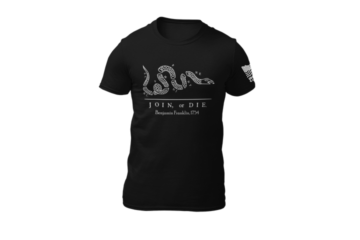 Wear a piece of American history with this bold and meaningful “Join, or Die” tee — a design rooted in unity, patriotism, and the fight for freedom. Inspired by Benjamin Franklin’s iconic 1754 political cartoon, this shirt features the segmented rattlesnake symbol representing the early colonies and the powerful reminder that America’s strength has always come from standing together.