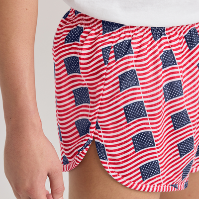 The Old Glory Running Short features an all-over American flag print in the same bold design and is made with a heavier fabric to make the colors pop. Built for performance and comfort, these shorts include a built-in brief, a covered elastic waistband, and an interior pocket for keys, cash, or ID.