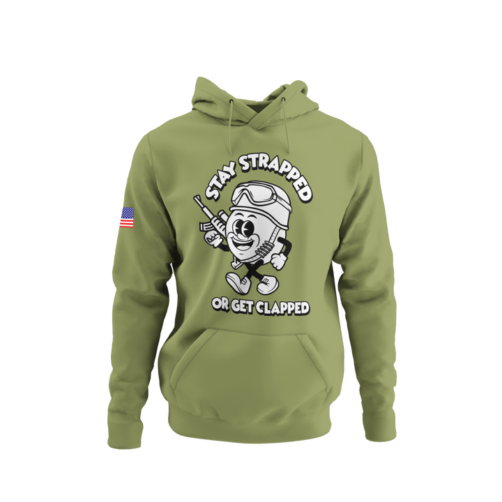The Stay Strapped or Get Clapped hoodie from Grumpy G.I. Gear brings humor and hard truth together for those who live ready. Featuring our battle-hardened emoji geared up for action, this hoodie is for the warriors, patriots, and everyday defenders who know the value of staying prepared.